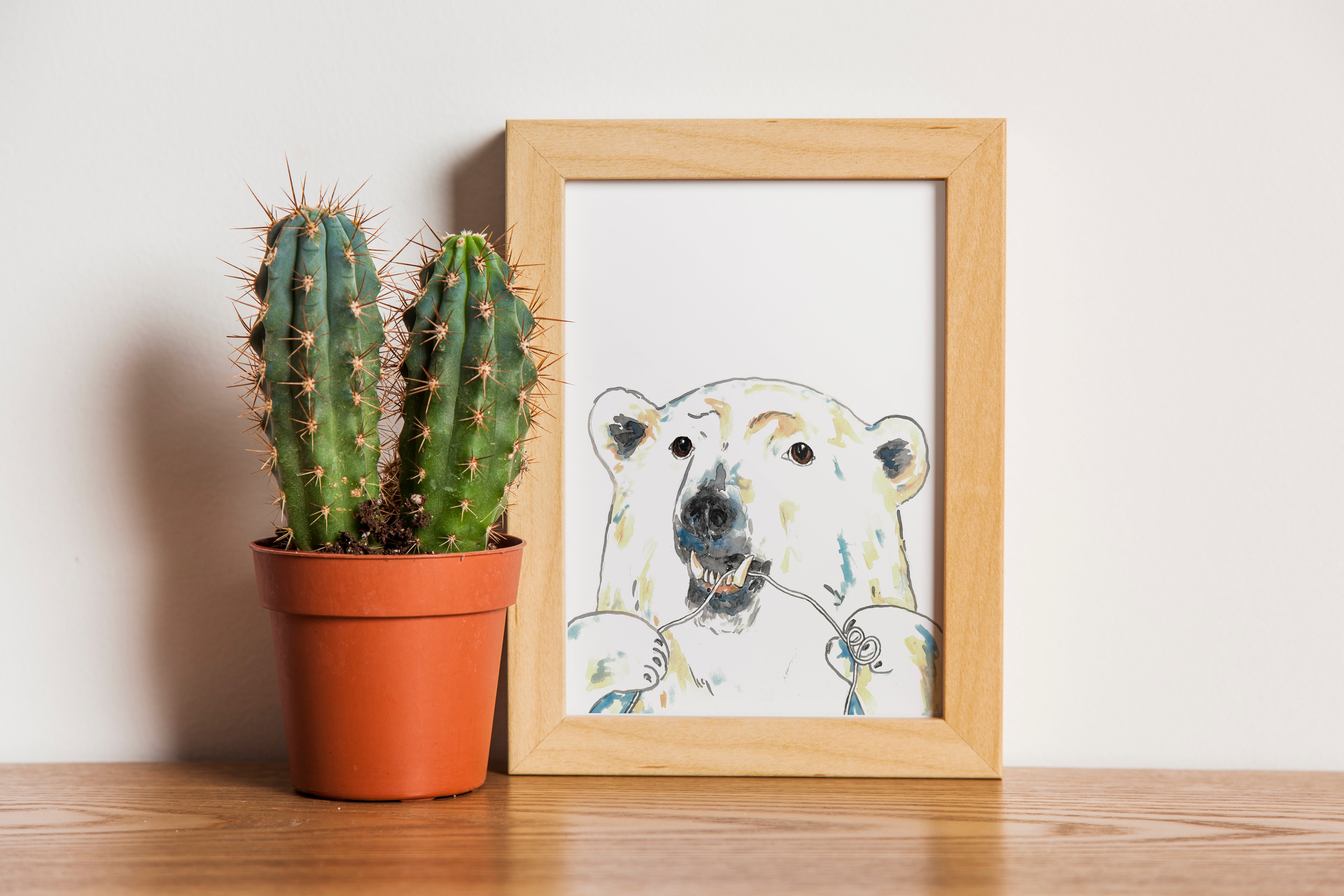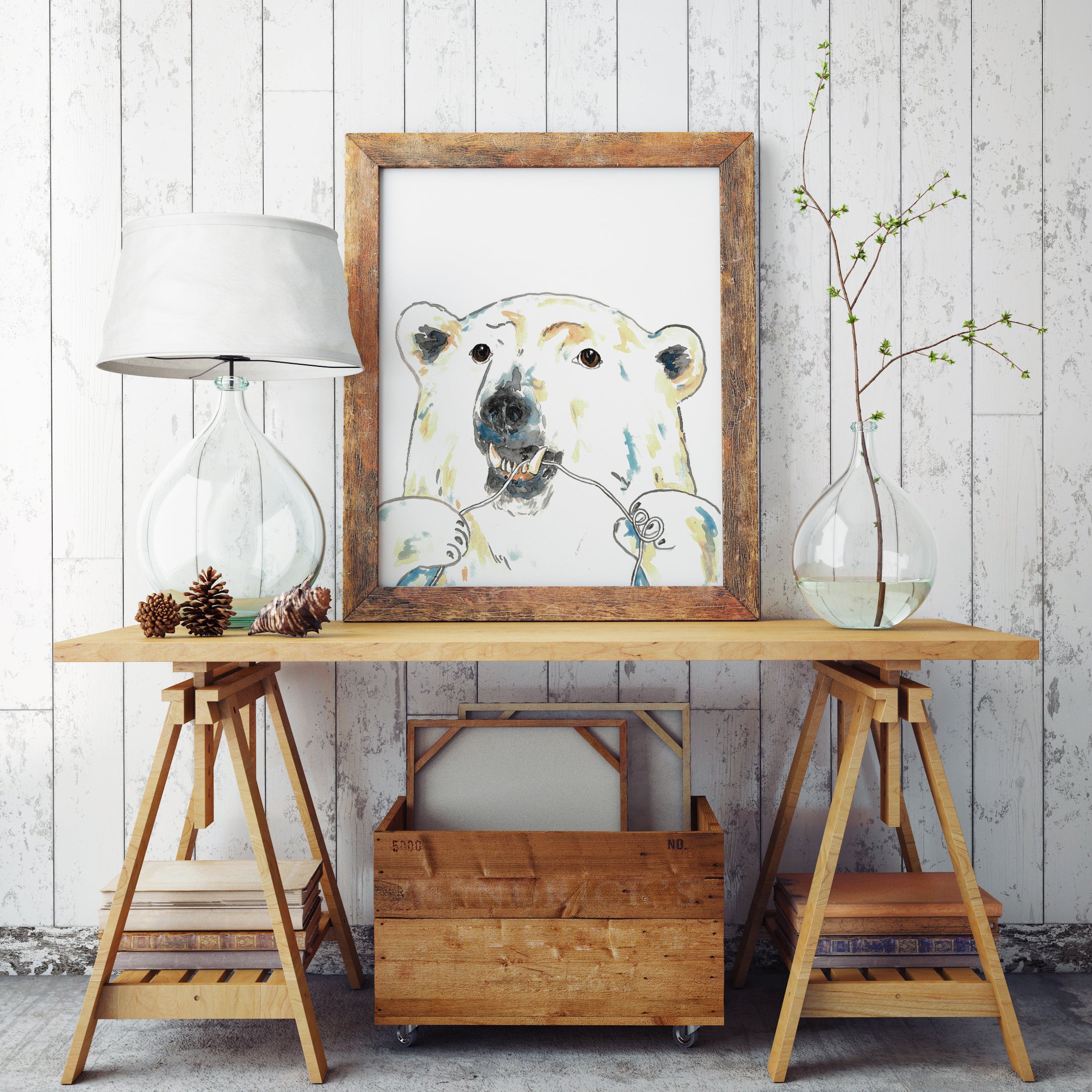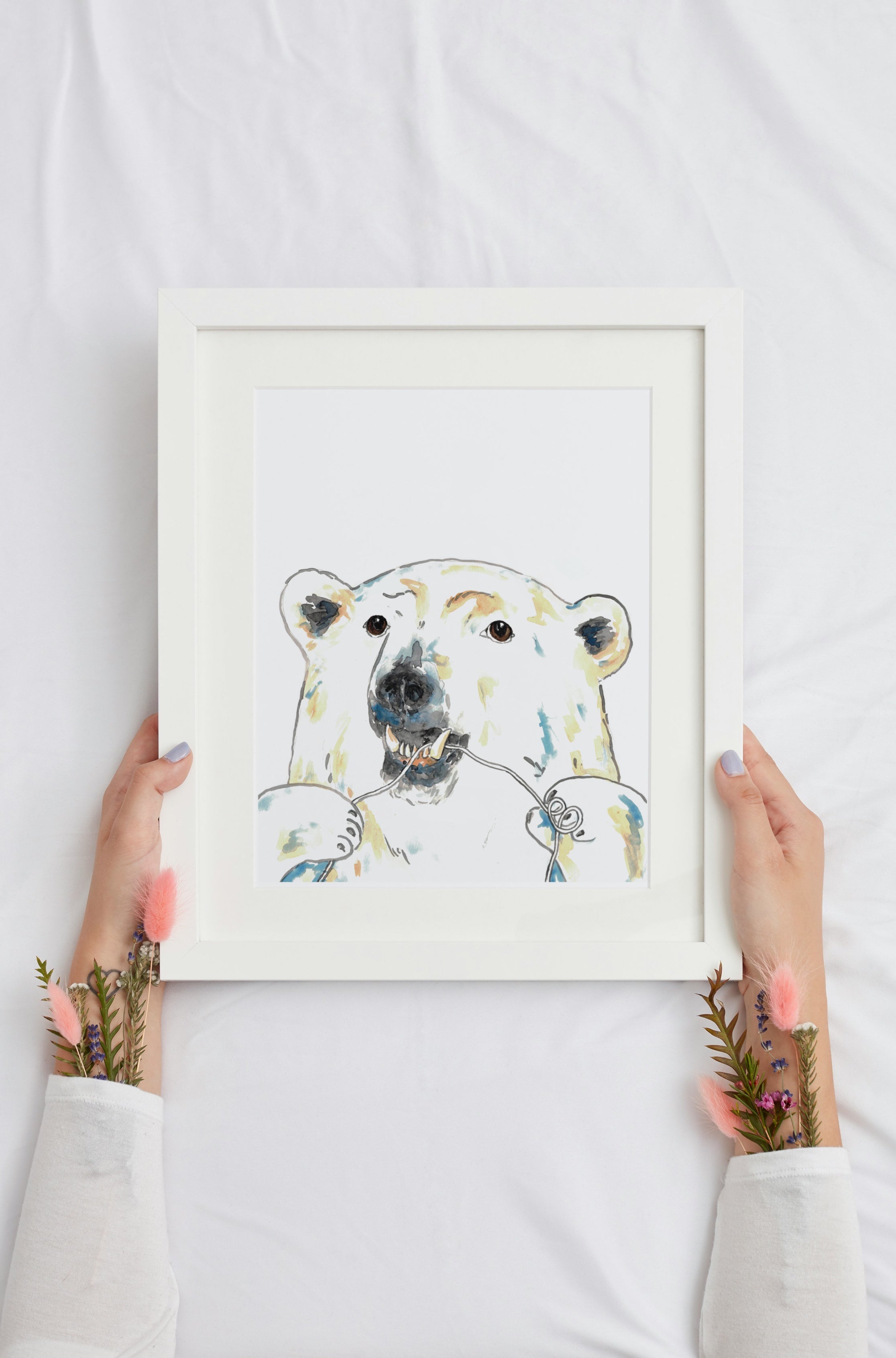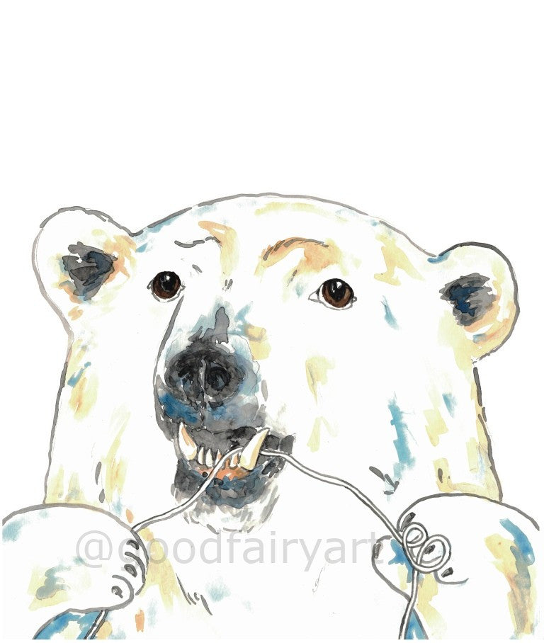 Polar bear flossing brushing teeth bath watercolor painting print art bathroom room washroom tooth brush nautical wall poster decor floss